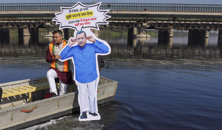 On early Saturday, BJP New Delhi assembly constituency candidate Parvesh Verma took a boat ride in the Yamuna River, carrying a life-size cut-out of Kejriwal. He was accompanied by his party colleagues.