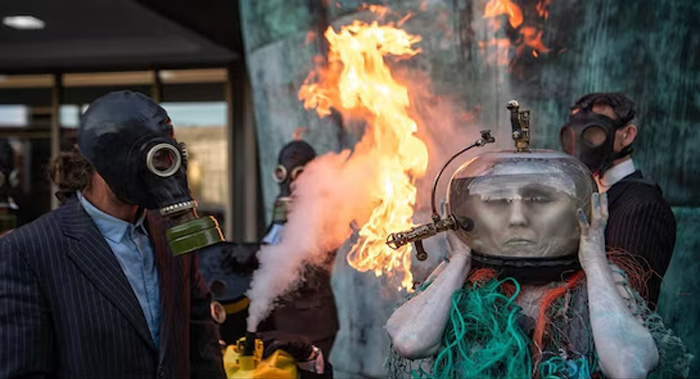 The images show, one activist, dressed as an “ocean goddess”, donning a fishbowl on her head filled with black liquid as though she was drowning. She could be seen screaming as the liquid engulfed her face before it quickly drained from the bowl. Other protesters around her were seen wearing gas masks and brandishing petrol pumps with flames spouting out of them.