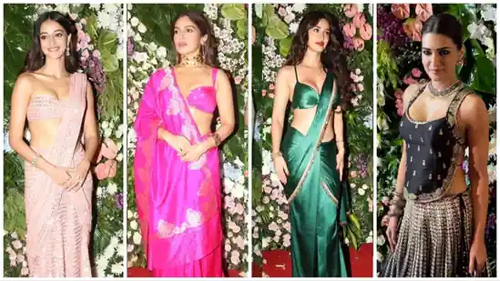Ananya Panday wore a shimmery soft pink narrow lehenga paired with a strapless blouse. She wore little jewellery that went well with the look. She had her hair in soft curls and let her attire steal the attention. Bhumi arrived in a silk saree tied in a seedha pallu style. She paired it with a tiny blouse and a choker necklace. Kriti Sanon too made an appearance at the party in a black lehenga with a backless top. She had her hair tied in a neat bun and accentuated her look with a necklace and earrings.