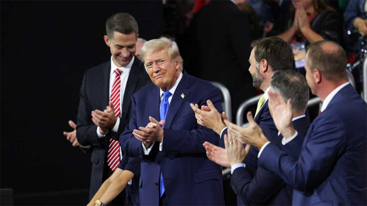 The show of harmony was intended to contrast with the Democratic Party, which has spent weeks mired in intraparty tensions over whether Biden, 81, should abandon his reelection bid after his halting June 27 debate performance against Trump, 78, raised fresh questions about his age and mental acuity.