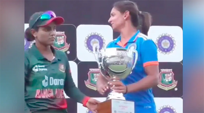 With the series ending in a draw, and the trophy being shared between the two teams, India and Bangladesh players were together called for a photo session at the end of the post-match presentation. However, in a video, that has gone viral all over internet, Harmanpreet can be seen derisively calling the umpires to join in when the trophy was handed to the two captains, with her act implying that they played a role in home team levelling the series, thus confirming the accusations made by Bangladesh players after the match. In the video, the India skipper can also been mockingly clapping during the photograph session with her act targetting the home team, who can then been seen leaving the area with captain Nigar Sultana fuming at Harmanpreet.