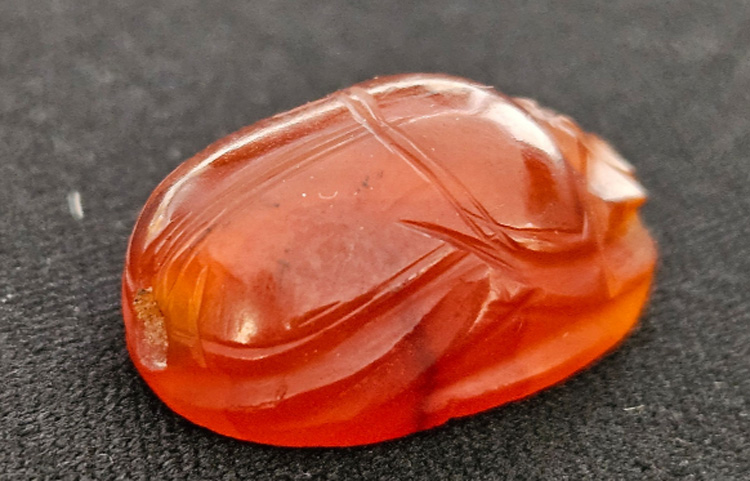 Scarabs were made from a wide variety of stones, including semi-precious stones like amethyst and carnelian, but most scarabs were made of steatite – a soft talc stone that usually had a bluish-green glaze. The glaze survived only in the dry climate of Egypt, so on scarabs found in Israel, almost no traces of glaze can be found, and appear greyish white. Against this background, the orange color of the scarab stands out.