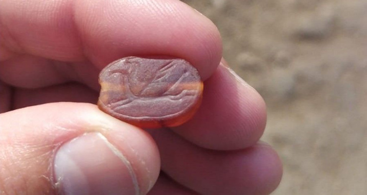 According to Professor Emeritus Othmar Keel of the University of Fribourg in Switzerland: “The scarab, made of a semi-precious stone called carnelian, depicts a griffin (a mythical creature) or a winged horse galloping. Similar scarabs were dated to the 8th century BCE.”