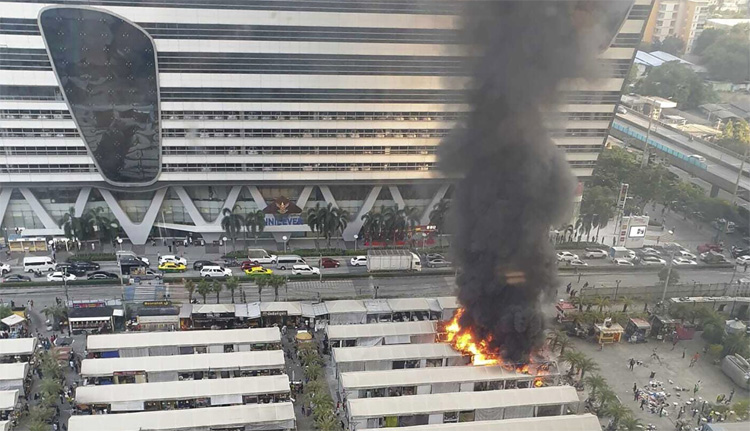 A fire at a popular market in central Bangkok threw clouds of black smoke which were visible from all over the Thailand capital. Videos shared widely on social media that were taken from nearby buildings showed two rows of covered stalls at the JODD Fairs Rama 9 market blazing.