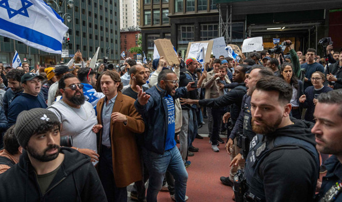 “We want to show the world that when Palestine rises up in resistance, the diaspora rises with it,” Munir Atalla, of the Palestinian Youth Movement, said before the scuffle.