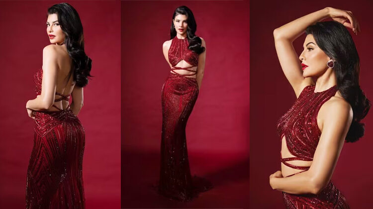 On Monday, Jacqueline Fernandez wowed her followers on Instagram with a series of breathtaking pictures. She can be seen donning a beautiful scarlet red gown which is from the shelves of fashion designer Bhawna Rao, while her styling is done by Namita Alexander. Her gorgeous dress boasted an exquisitely crafted, hand-embroidered pattern, adorning every inch of the fabric. Its chic, high-neck design paired with a versatile infinity-cut blouse made for a striking silhouette. The waist was accentuated with tasteful cut-out detailing, perfectly complementing the elegant, figure-hugging fish-cut shape. And to complete its breathtaking look, the dress featured a daring, yet alluring backless design.