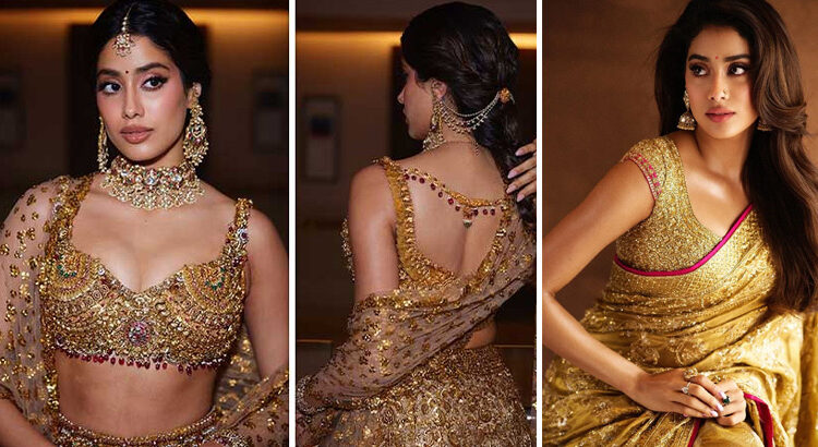 Janhvi embraced Indian traditional wear in this gorgeous tissue silk saree featuring a broad embroidered border. She wore the nine yards with an embroidered blouse featuring a backless design, a plunging neckline, and half-length sleeves. She styled the ensemble with emerald earrings, rings, mascara-adorned lashes, feathered brows, caramel lips, and rouge-highlighted cheekbones.
