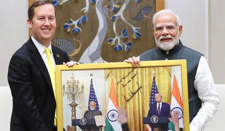 Gor also carried a framed photo of PM Modi and President Trump, which he presented to the Prime Minister. The picture bore Trump’s handwritten note: “Mr Prime Minister, you are great,” written with a bold marker.