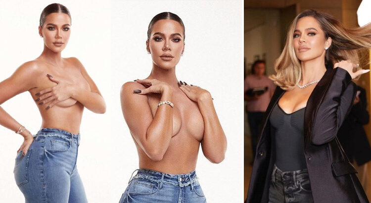 In the photos, Khloe, 39, ditched her shirt while modeling a pair of the apparel company’s tight-fitting denim jeans and suede, high-heeled boots.