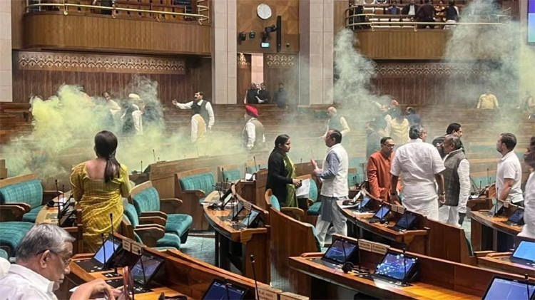 In a shocking security breach, two persons jumped from the visitors’ gallery into the Lok Sabha, chanting slogans and spraying a yellow gas from the canister. Both the intruders have been arrested and an investigation is underway.