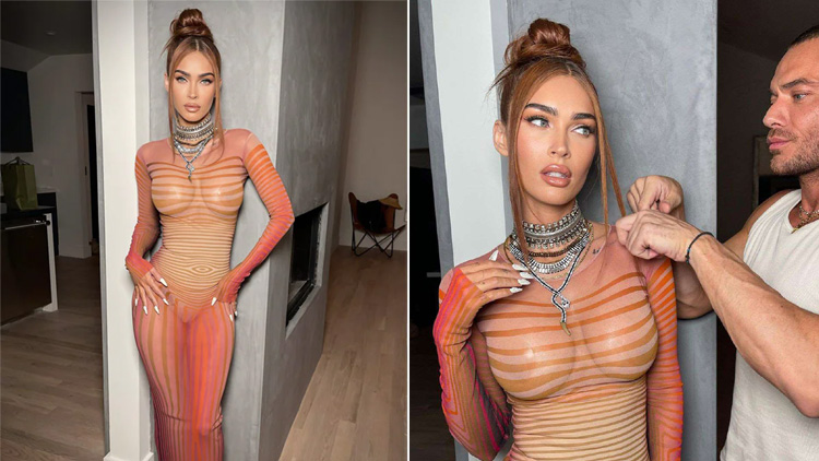 Not too long ago, Fox gave a sultry spin to the beachwear. She debuted with an unexpected beach outfit consisting of a sheer black dress and a silver bikini. The full-sleeved bodycon mesh dress, which went until the ankle, featured a huge cutout on the chest and torso, putting Megan’s toned abs and triangle bikini on display. To elevate the photoshoot, she embraced wet tresses and wore a bronzed and glowy makeup with a sleek black cat eye.