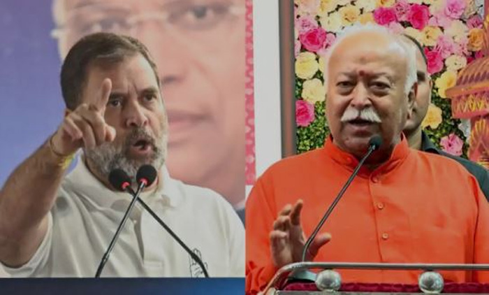 “Mohan Bhagwat has the audacity to inform the nation every 2-3 days what he thinks about the independent movement, Constitution. What he said yesterday is treason because it states that the Constitution is invalid, and the fight against the British was invalid. He has the audacity to say this publicly, in any other country, he would be arrested and tried,” Rahul Gandhi said in his speech.