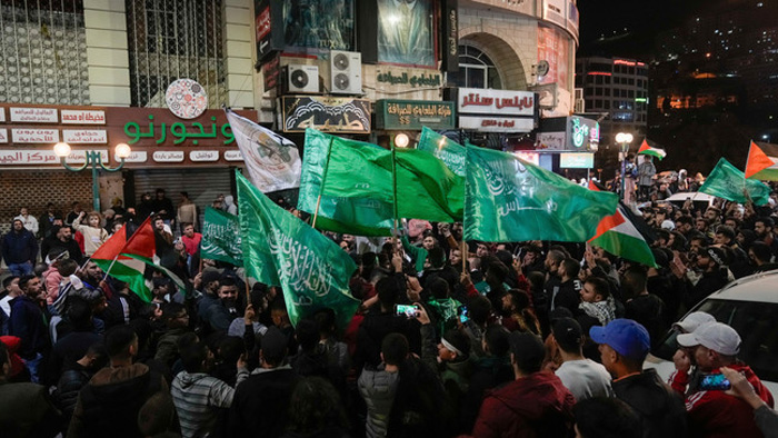 Some of those released were draped in Palestinian flags, others in the green flags of Hamas. They flashed victory signs as they crowd-surfed.