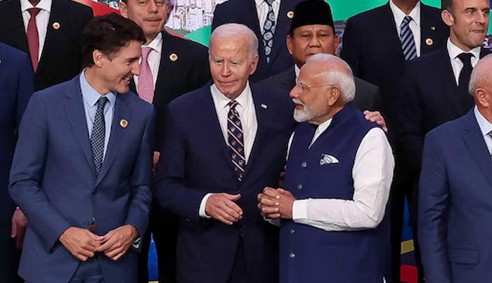 During a group photograph, Modi and Trudeau interacted with US President Joe Biden, who stood between them.
