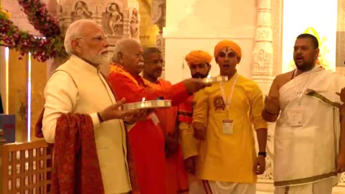 Prime Minister Narendra Modi and RSS chief Mohan Bhagwat offered prayers at the Ayodhya Ram Janmabhoomi Temple ahead of the ‘dhwajarohan’ ceremony, during which a 10-ft-tall, 22-ft-long saffron flag will be hoisted atop the 191-ft ‘shikhar’. The flag features a shining Sun, an Om symbol, and the Kovidara tree. The ceremony—described by many as a symbolic “second pran pratishtha”—will be followed by an address from the Prime Minister.