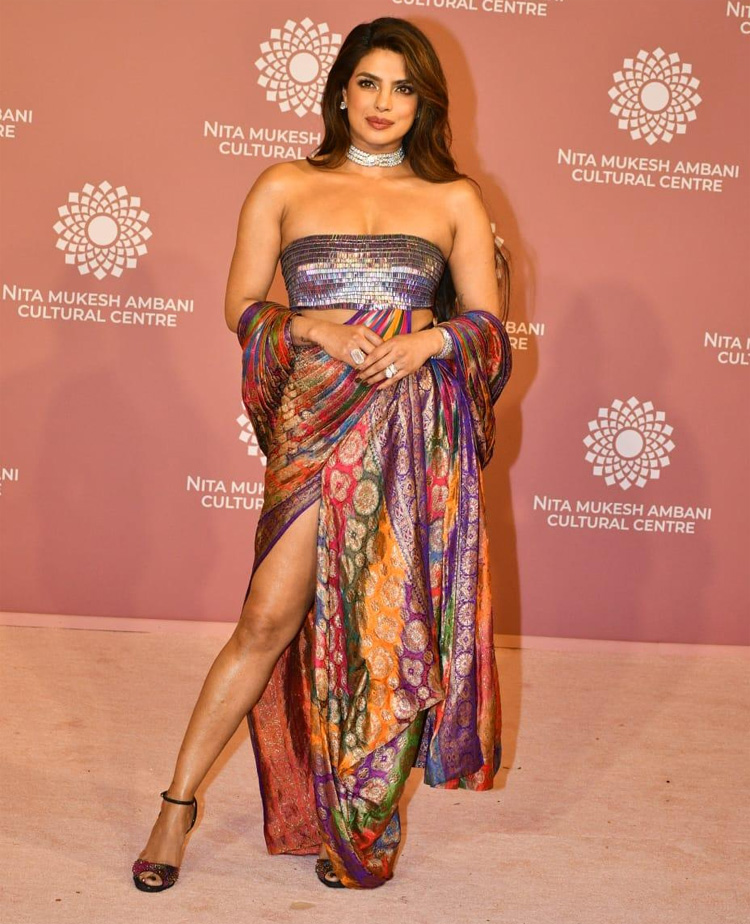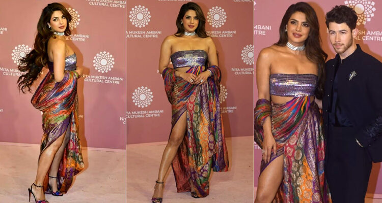 Actor Priyanka Chopra attended both days of the Nita Mukesh Ambani Cultural Centre (NMACC) Gala in Mumbai. Priyanka, with Nick Jonas, arrived at the starry affair dressed in a gorgeous custom Amit Aggarwal reimagined saree.