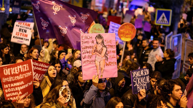 At the rally in Istanbul, Cigdem Ozdemir took aim at male violence against women and the Turkish authorities’ declaration of 2025 as “The Year of the Family.”