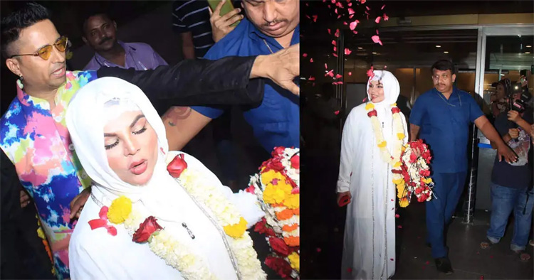 Actor Rakhi Sawant is back from Mecca after her Umrah. The former Bigg Boss contestant went to Saudi Arabia with a few friends for the pilgrimage. She returned on Thursday morning and was welcomed by some fans with garlands and floral showers at the airport.