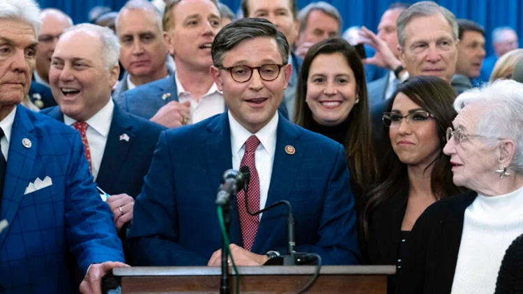 “Mike! Mike! Mike!” lawmakers chanted at a press conference afterward, surrounding Johnson and posing for selfies in a show of support.