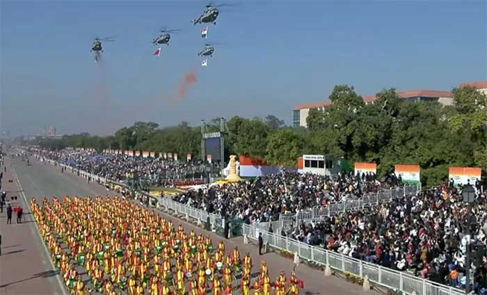 Following tradition, the National Flag was unfurled, the National Anthem was played, and a 21-gun salute was fired using 105 mm Light Field Guns developed in India. The President then took the salute as the parade proceeded.