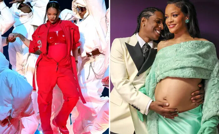 The “Diamonds” singer magnificently played up the grand pregnancy reveal during her captivating February performance. The opening moments of her show saw her affectionately cradling her stomach while gracefully unzipping her attire, a stylish ensemble consisting of a jumpsuit elegantly layered over a form-fitting bodysuit and a sculpted bandeau to unveil her growing belly, leaving the audience in awe.