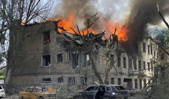 Video released by regional Gov. Serhiy Lysak showed fire engulfing the three-story building that appeared almost destroyed, with only parts of a wall standing, as firefighters battled the flames.