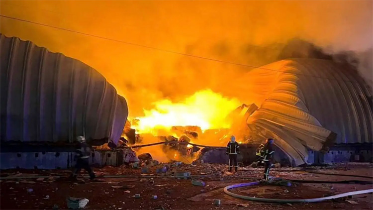 Ukraine’s prosecutor general’s office said 10 civilians, including a 9-year-old boy, were injured. Grain terminals were damaged as well as an industrial facility, warehouses, shopping malls, residential and administrative buildings and cars. Flames and smoke rose from shattered warehouses in video footage released by the emergencies ministry, which also showed a residential block with shattered windows.