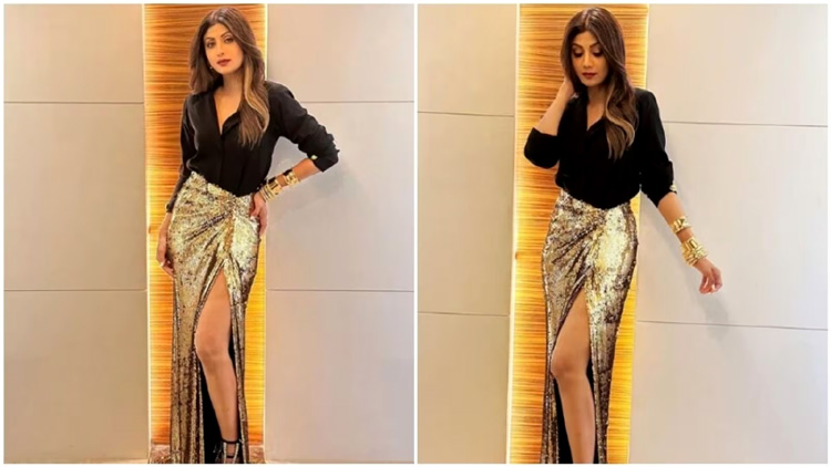 Shilpa, a day back, attended an event and shared snippets of her look on her Instagram profile. The actor knows how to bling it up, and she painted Instagram in colours of glitter all by herself with the glimpses of her look from the event. Playing muse to fashion designer house Tulua, Shilpa picked up a co-ord set for the event. The actor decked up in a black satin shirt with folded sleeves and a plunging neckline. She further tucked it inside a golden sequined shimmery bodycon long skirt with a long train and a thigh high slit. The skirt also featured gathered up details at the waist. The ensemble hugged her shape and showed off her curves perfectly. “Shining,” Shilpa captioned her pictures with these words.