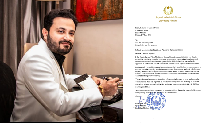 In a significant international recognition of his leadership and contributions to the field of education, Sir Dr. Chandan Agarwal, renowned educationist and entrepreneur, has been officially appointed as Educational Advisor to the Prime Minister of the Republic of Guinea-Bissau.
