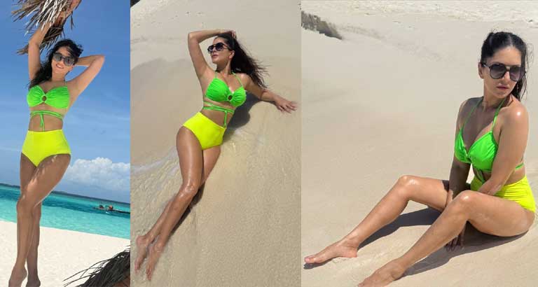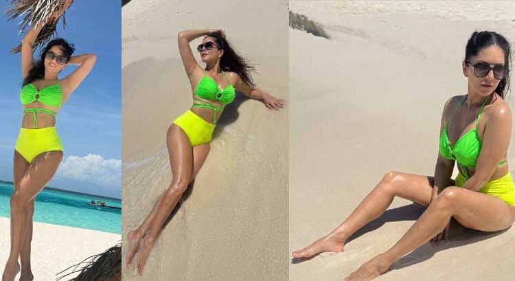 Her new beach photos are doing all the talking. Wearing a striking green bikini, Sunny is seen relaxing on the sand — half soaked in water, half glowing in sunlight. The pictures feel raw and effortless: her smile, her relaxed vibe, that natural beach glow — everything just falls into place. She looks unbothered, confident, and completely herself.