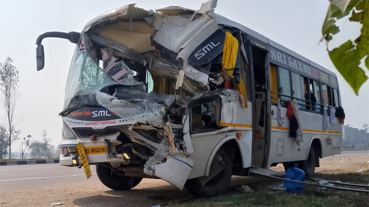 The bus, ferrying devotees from Delhi and Faridabad, was travelling from Delhi. The bus driver was trapped in the wreckage and had to be pulled out with great difficulty, said a police officer.
