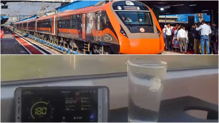 The video, shot from inside the train, showed the speedometer on a mobile screen briefly touching 182 kmph, while glasses filled with water and stacked one over another remained steady without spilling — highlighting the train’s stability at high speed.