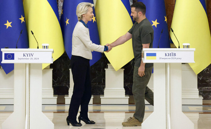 In a joint press conference with von der Leyen, the Ukrainian leader said his country planned to use a proposed multi-billion dollar European Union loan for air defense, energy and domestic weapons purchases.